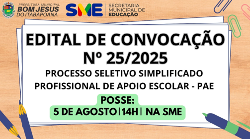 EDITAL DE CONVOCAÇÃO Nº 25/2025 – PROCESSO SELETIVO PROFISSIONAL DE APOIO ESCOLAR – PAE