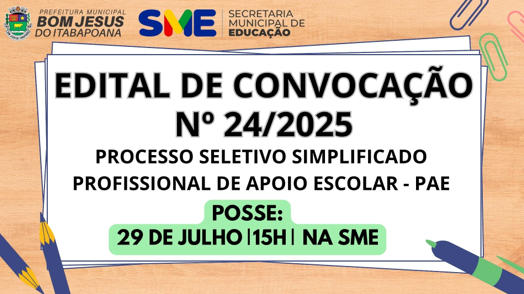 EDITAL DE CONVOCAÇÃO Nº 24-2025 – PROCESSO SELETIVO PROFISSIONAL DE APOIO ESCOLAR – PAE