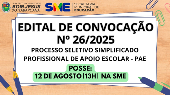 EDITAL DE CONVOCAÇÃO Nº 26-2025 – PROCESSO SELETIVO – PROFISSIONAL DE APOIO ESCOLAR – PAE