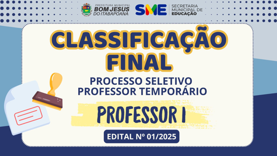 Continue lendo...RESULTADO DA CLASSIFICAÇÃO PROFESSOR I – PROCESSO SELETIVO/PROFESSOR TEMPORÁRIO